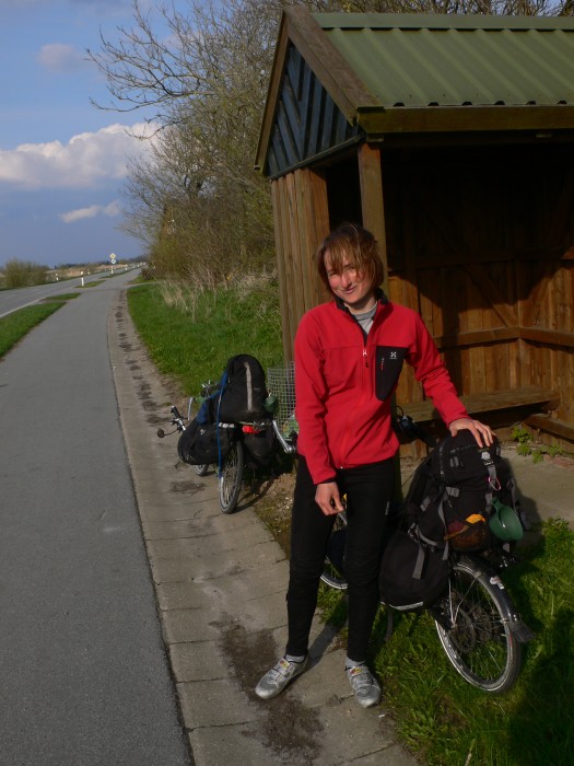 Met de wind eindelijk in de rug schiet het wel op. Bij Dagebüll kijken we nog één keer naar de Hallig Oland, en dan gaan we het binnenland in, op naar de Deense grens. Op de één of andere manier kunnen we voelen dat we het einde van Duitsland naderen, "het land rafelt uiteen", zoals de Russische dichter Joseph Brodsky het ooit omschreef. Bij Rosenkranz gaan we de grens over, en meteen voelt het land anders, de gebouwen en weilanden zien er anders uit, de boeren gebruiken andere machines. Vreemd. Even wennen.