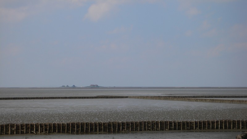 We zijn nu in het gebied van de Halligen. Dit zijn kleine eilanden zonder zeewering. Het zijn stukken kwelder met wat terpen die bij een flinke springvloed bijna helemaal onderlopen. Het vee en de touristen worden dan op de terp getrokken tot het water weer weg is. Zo leefde men tot duizend jaar geleden overal in de lage landen, en hier dus nog steeds. Het is heel bijzonder om hier langs te fietsen of te varen. Je ziet een streepje op het water liggen, met wat terpjes, en dat is dan het eiland.